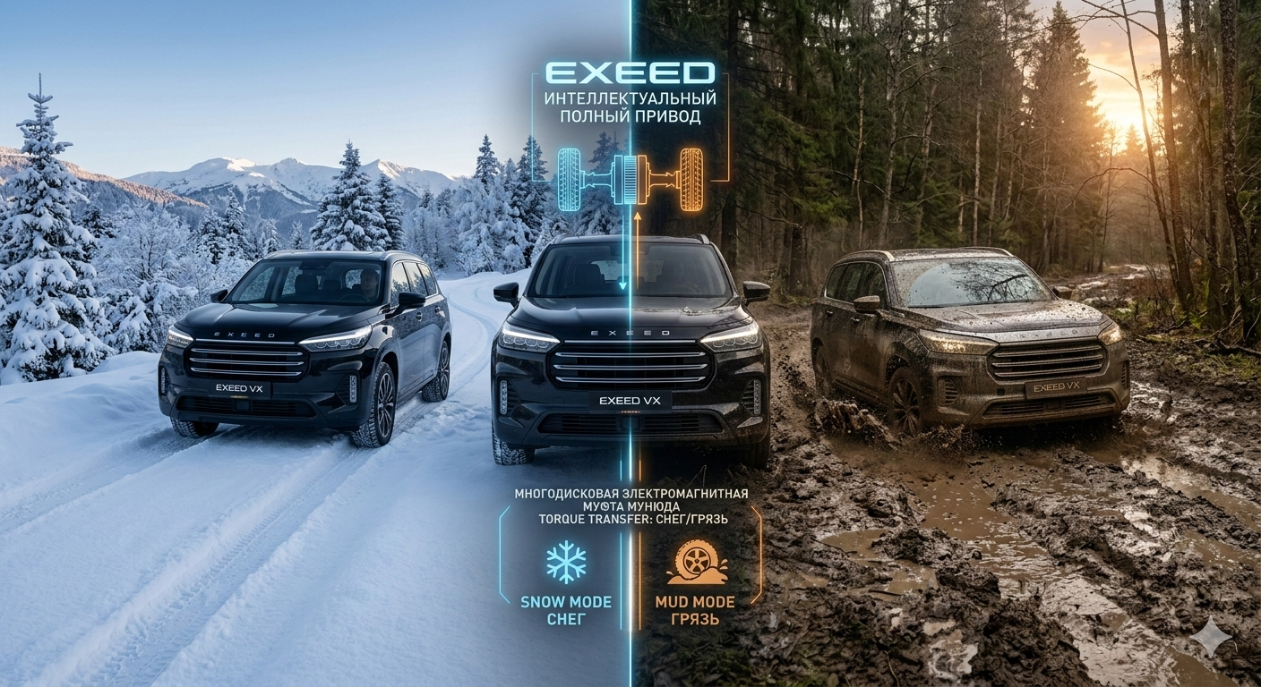 Поездка на дачу после затяжного ливня или выезд из заснеженного двора зимним утром — классические испытания для городского автовладельца. Непредсказуемая погода диктует свои правила, но интеллектуальный полный привод EXEED позволяет менять их на ходу. Вам не нужно быть профессиональным джипером, чтобы уверенно чувствовать себя вне асфальта. Умная электроника берет контроль на себя, обеспечивая безопасность и комфорт. Разбираем, как это работает на практике.